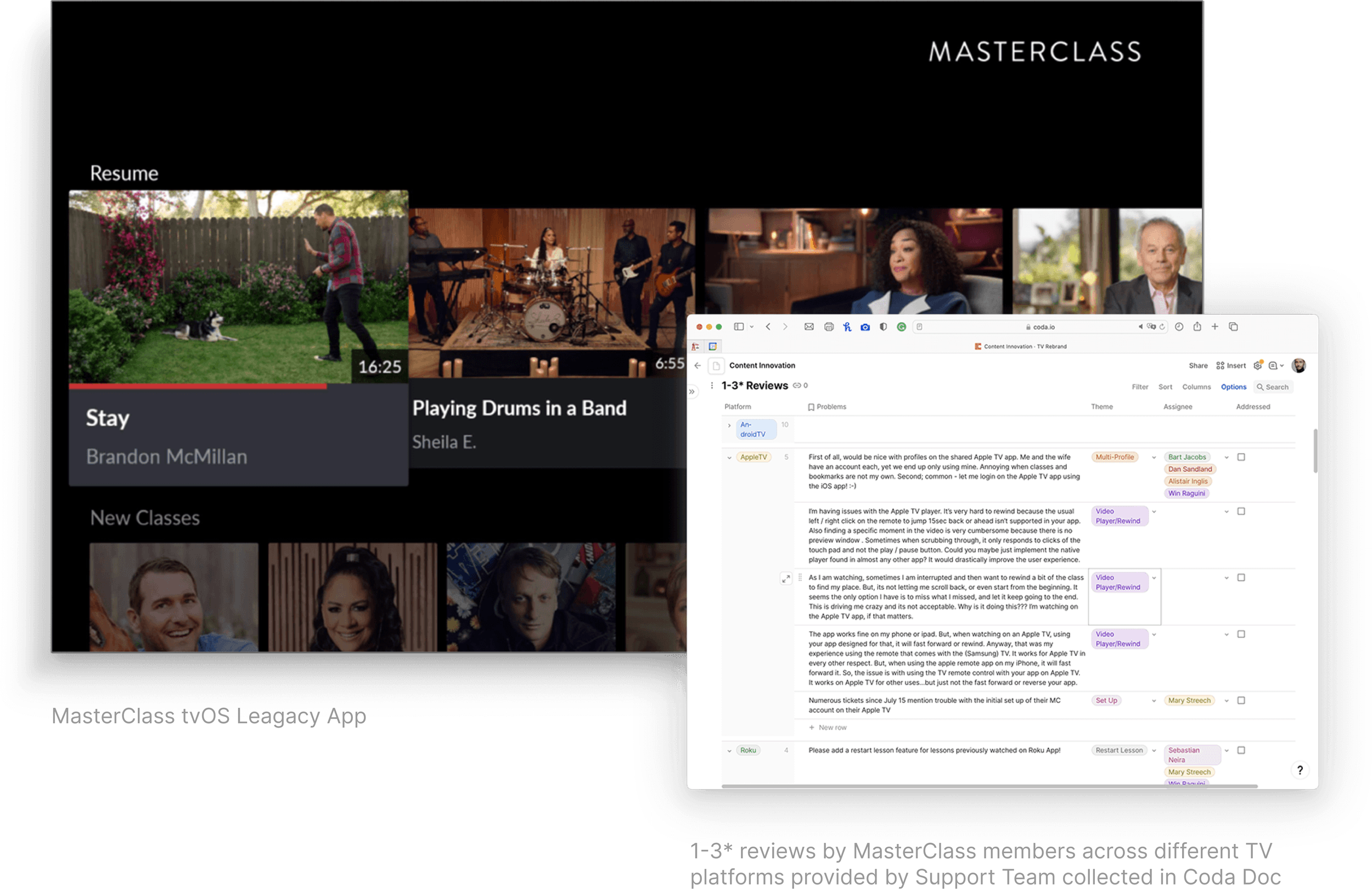 In the middle of the pandemic, I was in charge of the TV app redesign, being miles away from each other, we were able to deliver astonishing product and impressive results. It would not be possible without the most amazing team at MasterClass: Product Managers, Developers, Data team, Customer Support, Content Team, Motion Designers, User Researchers, Marketing, and Third Party Agency as well as the Content and Audio team.